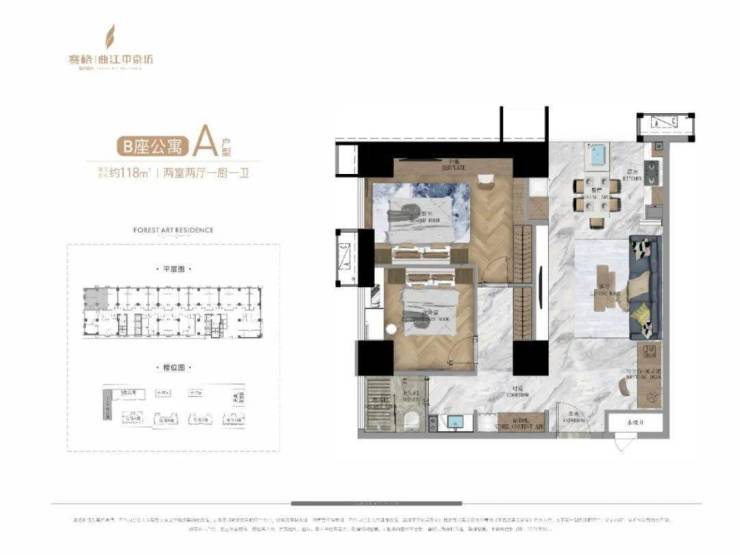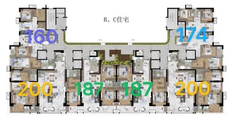 公寓产品中,A栋公寓为一栋约140米高、42F的超高层产品,其中33—42F打造的是建面约500㎡的总裁公寓,产品共计有30多套,单层层高3.9米,客厅挑空7.8米,一梯一户,一层两户,独享五星级入户大堂,2—32F则是约50—161㎡、 4T24户的平层公寓产品。B栋公寓为建面约50—129㎡、6T23户平层产品;C栋公寓为建面约80—120㎡、 4T12户平层产品。