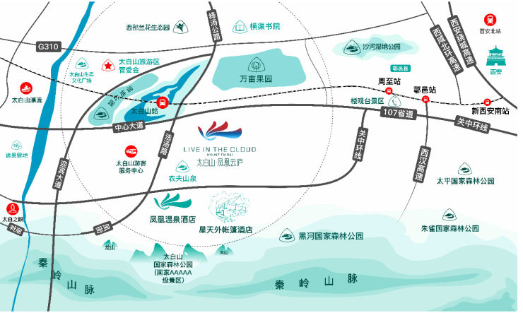 【源起·太白之芯】项目坐落于宝鸡市眉县国家5A级景区太白山脚下,汤峪河畔,距太白山湿地公园仅150米,距太白游客中心直线距离仅900m,北侧紧邻107省道,占据太白山旅游度假区的核心板块。