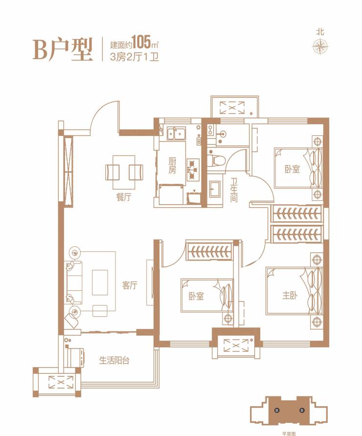 ①高层住宅产品为1-5#楼,总高23-25层,2梯4户,由约105㎡和137㎡的全明三房户型组成;