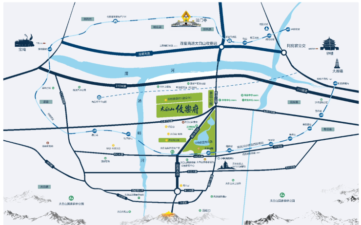 【交通配套】?紧邻连霍高速太白山站距杨凌南站约20km约1.5h直达西安、1h连接宝鸡西法城铁开通后约25分钟即达西安鄠周眉高速已在建设中,太白山收费站举步即达