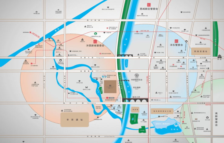 交通:科技路—镐京大道(BRT快速干道)、红光路—沣东大道、科技六路延伸段(在建中)、地铁5号线(“文教园”站,已开通)、地铁16号线(欢乐谷)、高铁阿房宫站。