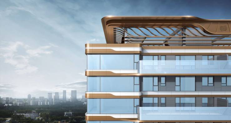 立面采用”湾流G700“平滑的曲线机翼,定制楼体天空之翼的顶冠造型。南立面玻璃幕墙+栏板占比高达95%。