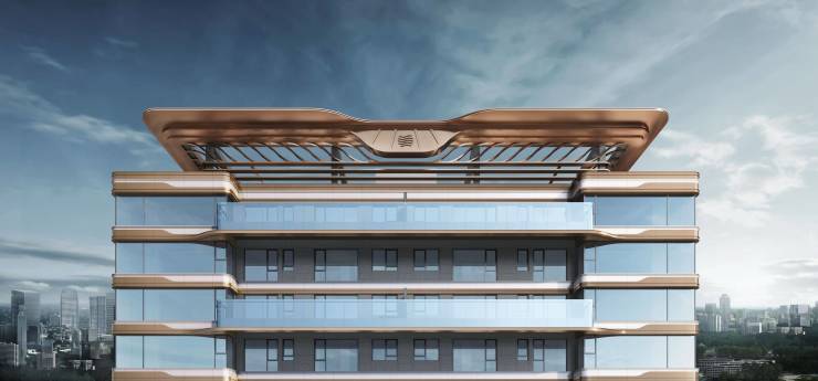 立面采用”湾流G700“平滑的曲线机翼,定制楼体天空之翼的顶冠造型。南立面玻璃幕墙+栏板占比高达95%。