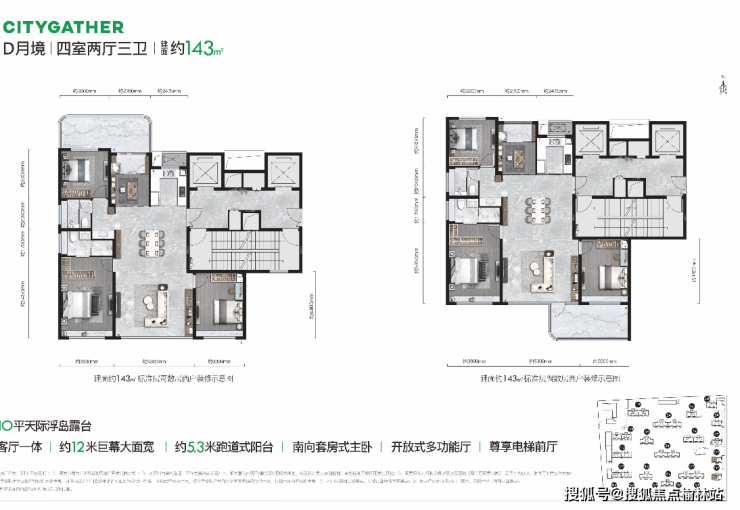 「月境」建筑面积约143m² | 四室两厅三卫近10平天际浮岛露台参客厅一体 | 约12米巨幕大面宽约5.3米跑道式阳台 | 南向套房式主卧开放式多功能厅 | 尊享电梯前厅
