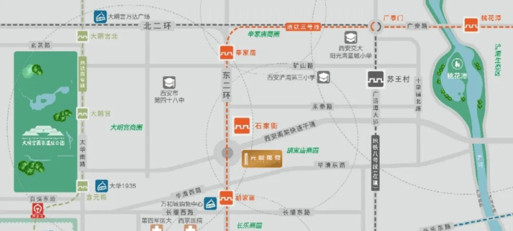 项目位于西安东二环黄金腰带位置,石家街转盘东南50米(地铁3号线石家街站),东接浐灞新区,南邻轻工商贸中心,西近大明宫遗址,北接繁华的未央区,处于金花路商圈的核芯居住区,也是浐灞生态区的门户位置。