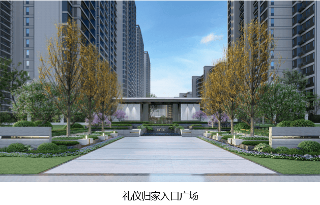 入口迎宾轴,以银杏列植的手法,结合场地高差设计,台地花园,雅致大气的门廊及无障碍通道,打造入口礼仪归家大道。让归家成为一种沉浸式的森居体验。