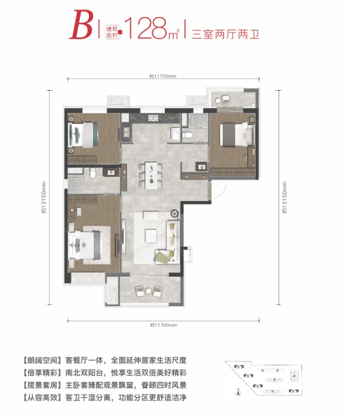 三室两厅两卫的户型有110㎡,128㎡,143㎡,四室两厅两卫户型有198㎡,在这个快餐时代,在什么都讲究效率的时代,万科东望给了属于你的私人空间,让你在忙碌的工作中找到自己的生活与港湾。